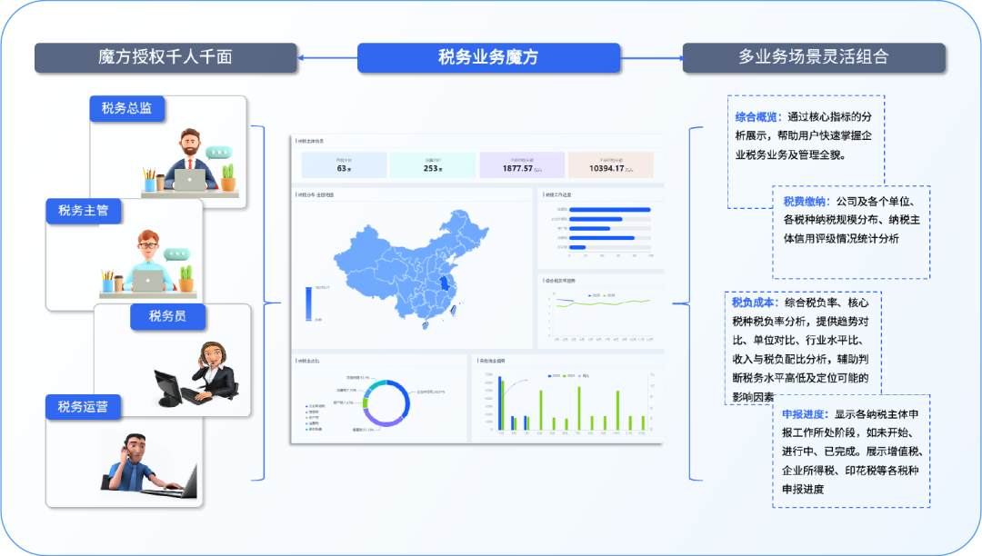 ◇魔方式税务看板:依托智能BI引擎及可视化看板,预置覆盖税负波动看板、跨期比对模型、行业对标雷达等多标准化分析场景模板,支持灵活组合与个性化配置,魔方式实现“千人千面”的税务分析展示;除标准化模版外,支持自定义报表生成,助力企业实现从数据洞察到经营决策的闭环管理。