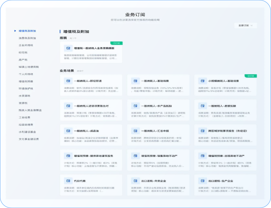 ◇自适配业务场景库:深度嵌入预制化、跨行业、全税种的标准业务资源,通过一业一模型,快速适配多元化业务场景与政策差异,支持集团型企业按需灵活订阅,实现税务管理“即开即用”。