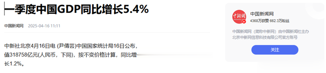 2025年一季度中国GDP实际数据为31.88万亿元人民币,折合成美元约为4.44万亿美元,同比增长5.4%。
